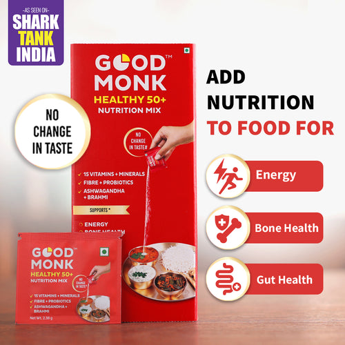 The Healthy 50+ Nutrition Mix for Seniors is specifically formulated for older adults aged 50 and above. As the best multivitamin nutrition mix for old age, it includes 15 essential vitamins and minerals, lysine for protein building, and herbs like Ashwagandha and Brahmi to enhance overall bodily function and well-being.