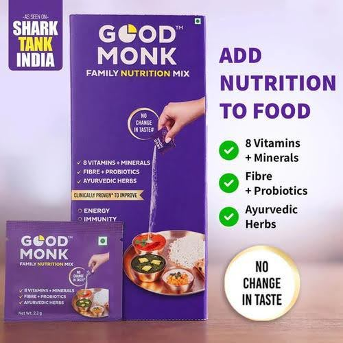 Good Monk nutrition powder includes vitamins A, B6, B12, C, and D and minerals like iron and zinc. It also contains herbs like ashwagandha and brahmi. This nutrition mix also contains probiotics and dietary fiber.