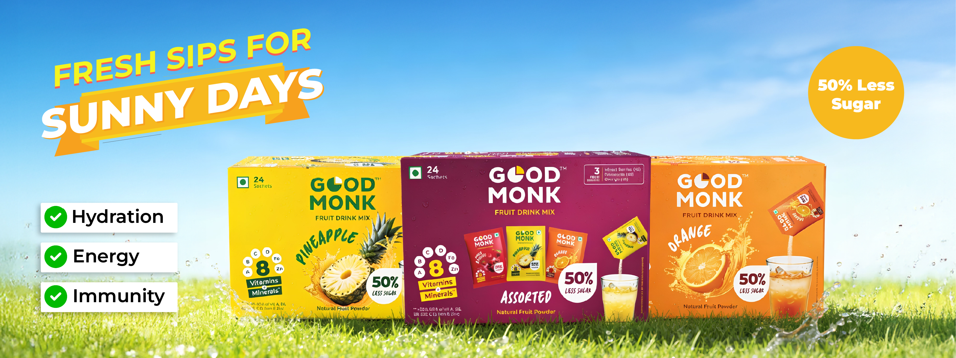 Unlike regular bottled fruit juices, Good Monk’s fruit drink mixes contain 50% less sugar and are fortified with 8 essential vitamins and minerals. This is a better nutrient-packed alternative.