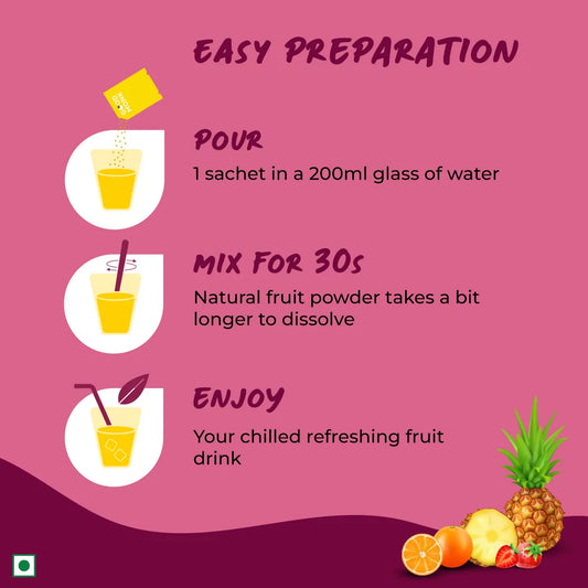 To experience the benefits of drinking fruit juice daily, you can pour one sachet into a 200ml glass of water and mix for 30 seconds. After that you can sit back and enjoy your chilled fruit drink!
