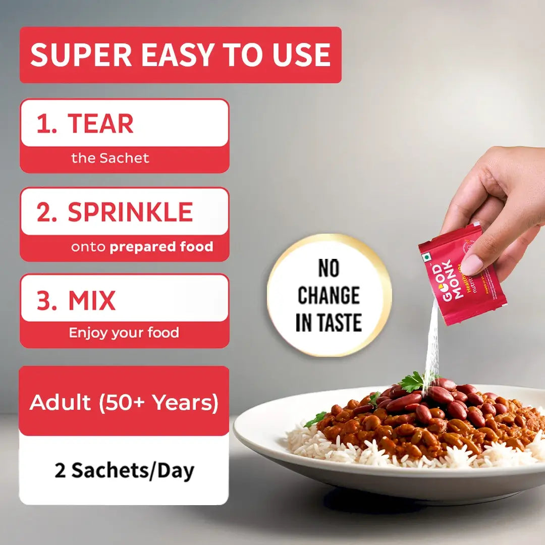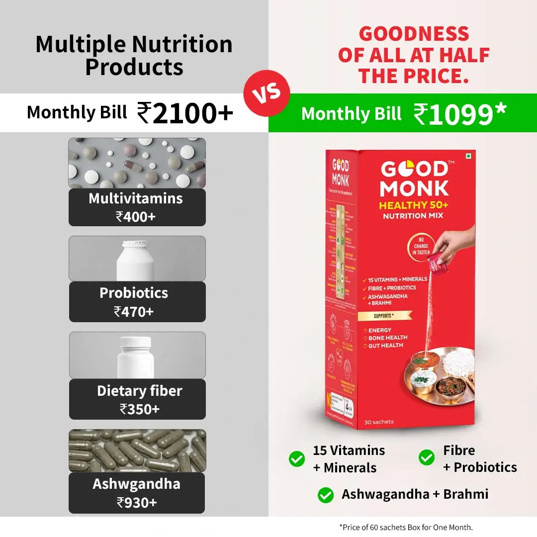 As we grow older, our nutritional needs change, and food alone doesn’t always keep up. Good Monk Healthy 50+ Nutrition Mix is India’s first multivitamin food supplement designed specifically for seniors, that can be easily added to your daily meals without changing taste, colour or smell.