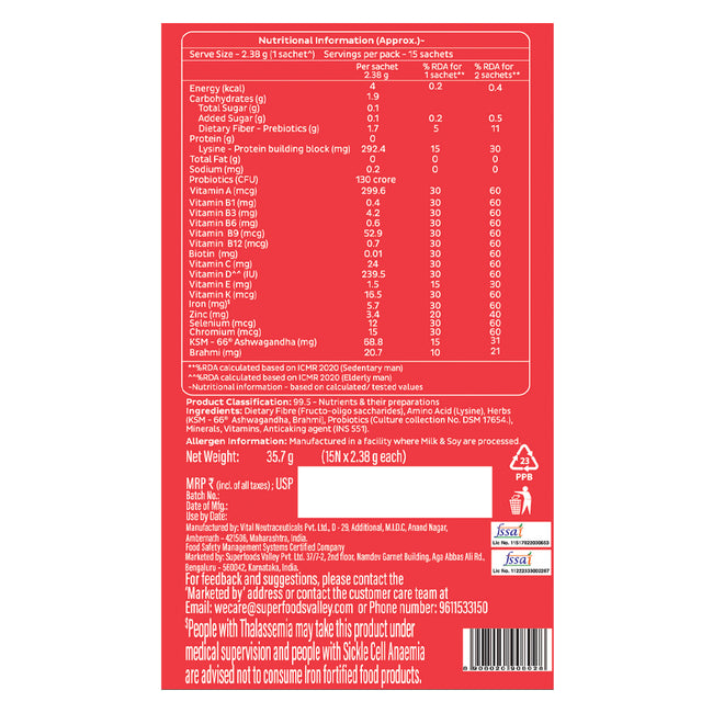 It's incredibly convenient: each sachet is portioned for one serving, and I just sprinkle it over my dal, curry, yogurt, or even smoothies. No weird aftertaste, no prep time—just add and eat. It's also free of added sugars, preservatives, and artificial stuff, which gives me peace of mind, especially since it's suitable for the whole family (ages 4-50). I've noticed better focus and fewer minor illnesses too, likely from the immunity-boosting vitamins C and D.