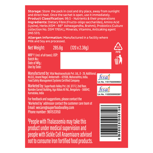 • Clinically Proven Probiotics, Fibre, Ashwagandha & Brahmi