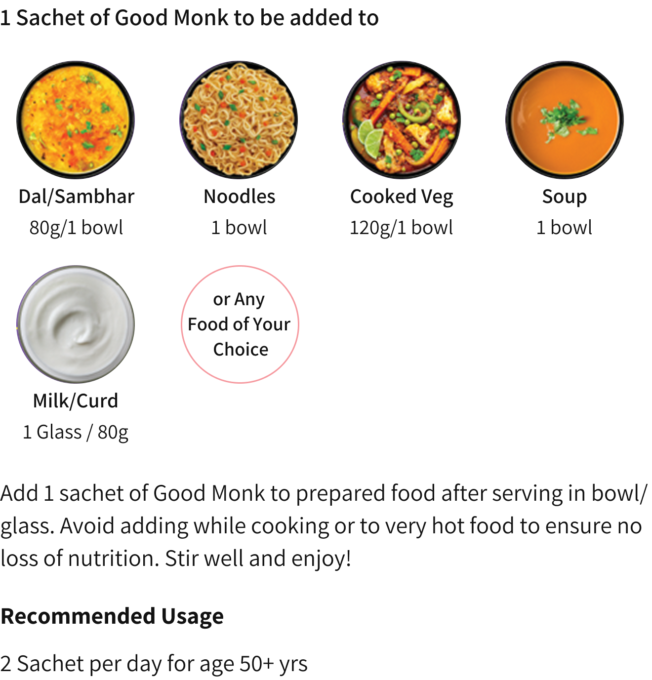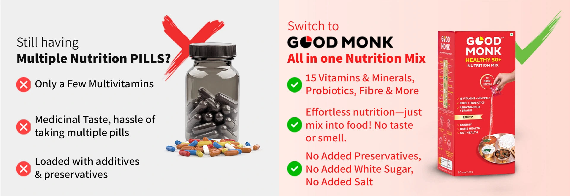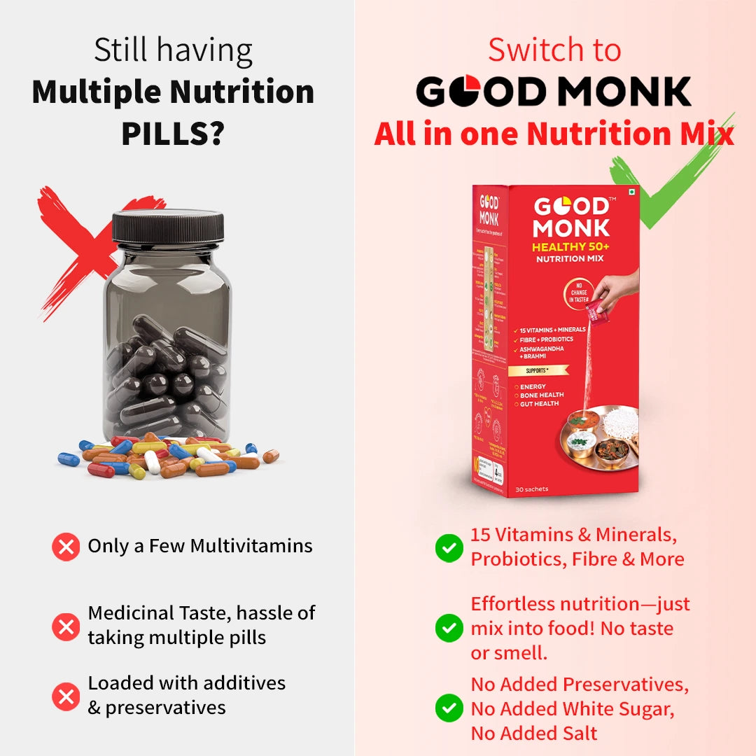 Take Good Monk 50+ Nutrition Mix daily by mixing one sachet into your cooked food or drinks after serving; there will be no change in taste or smell. This blend is among the best multivitamin powder in India and acts as a superior alternative to multivitamin tablets for old age, supporting energy, immunity, and bone health.