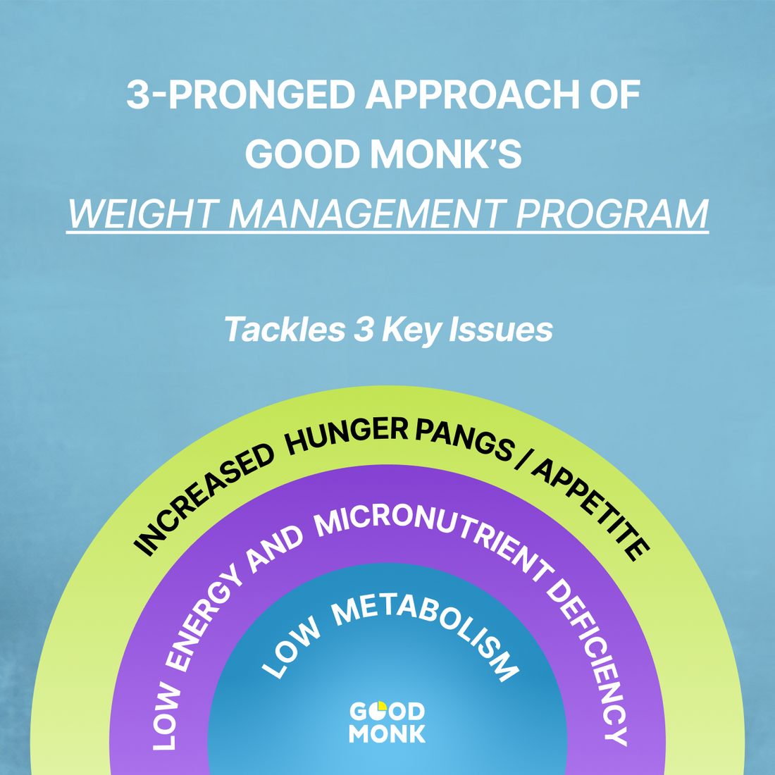 Most weight loss programs in India either come with crash diets, complicated rules, or a full-time chef who's going to be at your beck and call. Well, not here. Good Monk’s weight management program is built around a simple, 3-way holistic approach that is backed by real science and not any shady shortcuts.