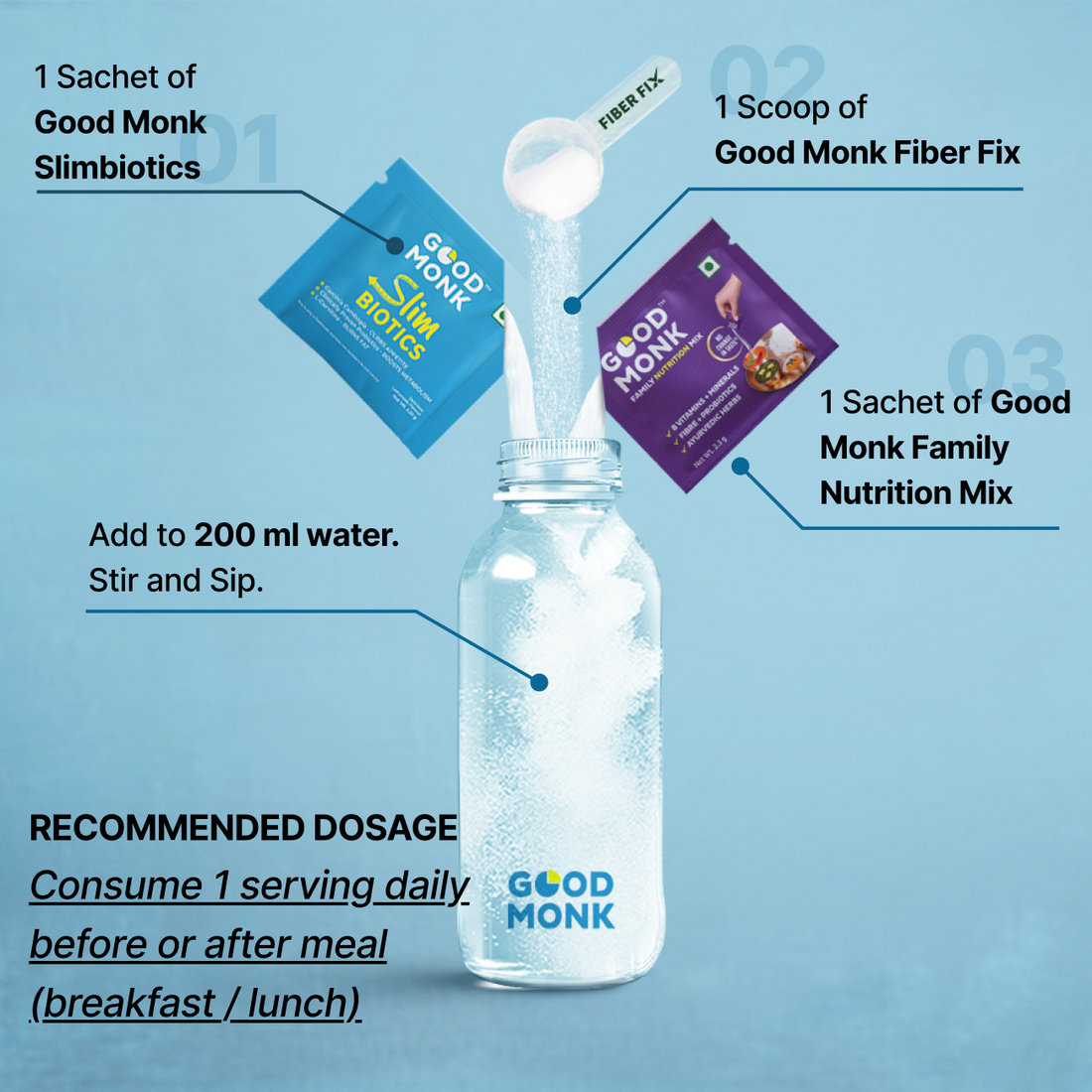 Just mix 1 sachet each of Slimbiotics, Family Nutrition Mix and 1 scoop of Fiber Fix with 200 ml of water. Stir it and sip once a day before or after breakfast and lunch.