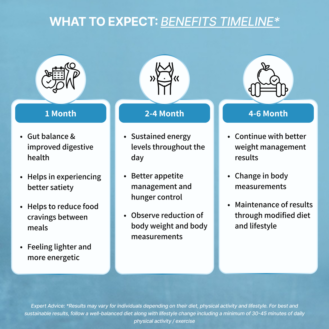 The results can vary from person to person. However, most users reported a visible difference in 4-6 weeks. To experience all the benefits of these weight management products, we recommend you to stick with them for 3-4 months along with a balanced diet and 30-45 minutes of movement a day.