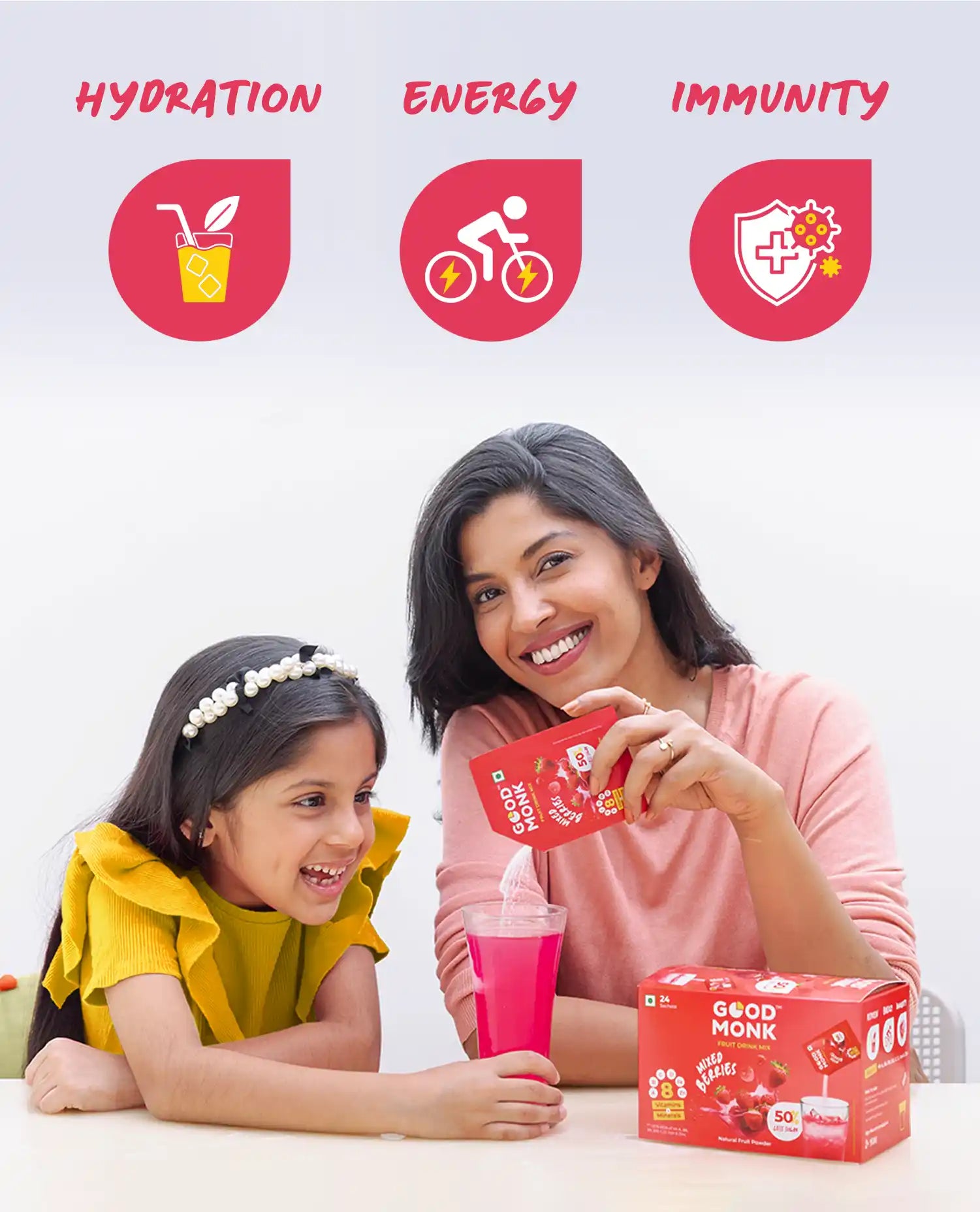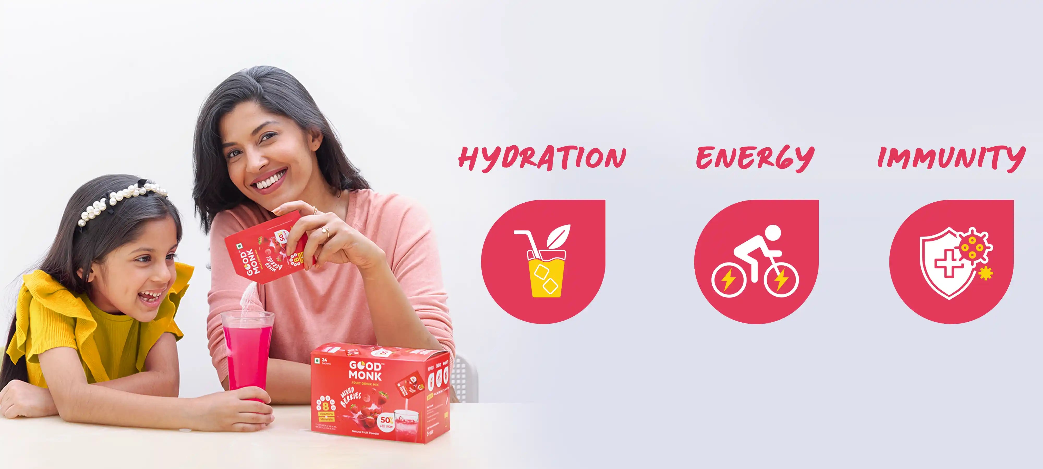 Good Monk’s berry mix juice quickly replenishes the fluid you have lost. It gives you instant hydration, making it an ideal drink for hot summer days, as a workout recovery fruit drink or as an office drink mix for hydration.