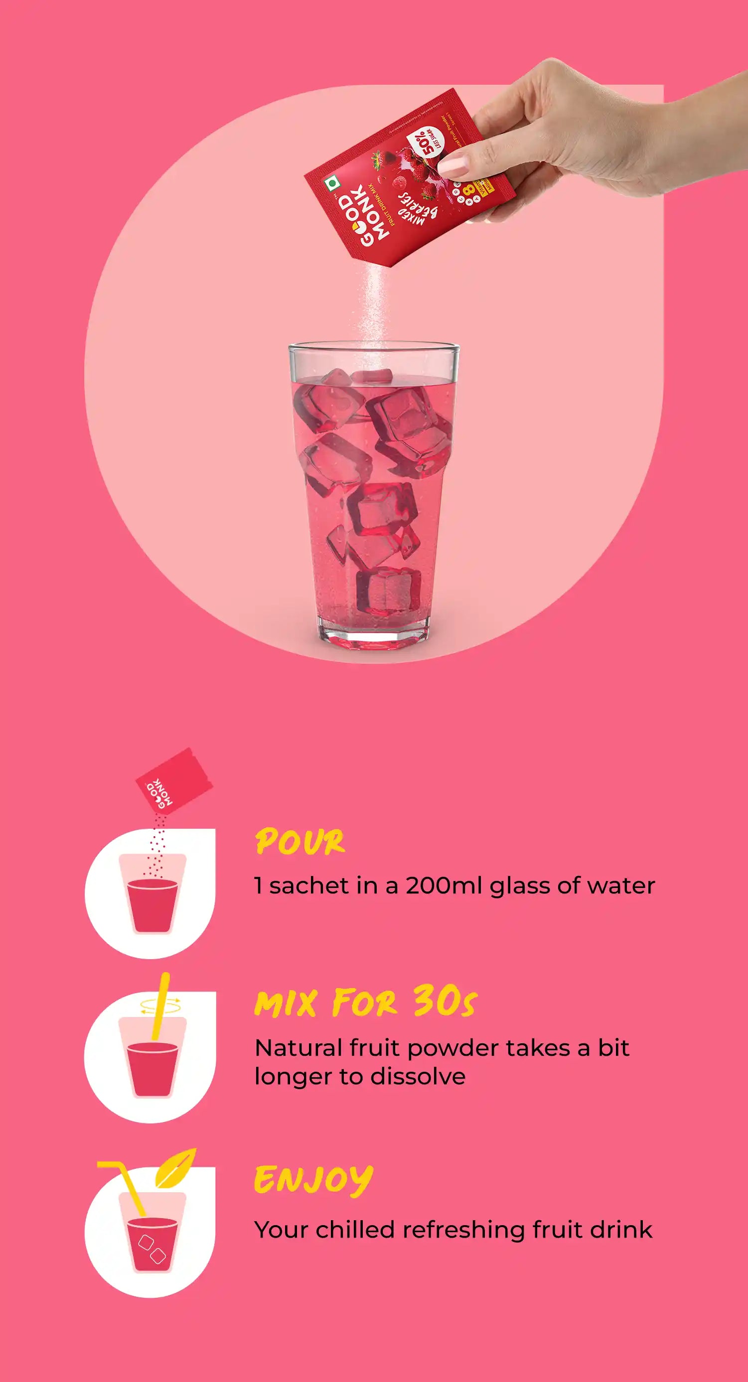 Stay nourished and refreshed with the Instant Fruit Drink Mix from Good Monk, a delicious and mouth-watering blend made from natural mixed berry powder and packed with plant-based, clean ingredients.
