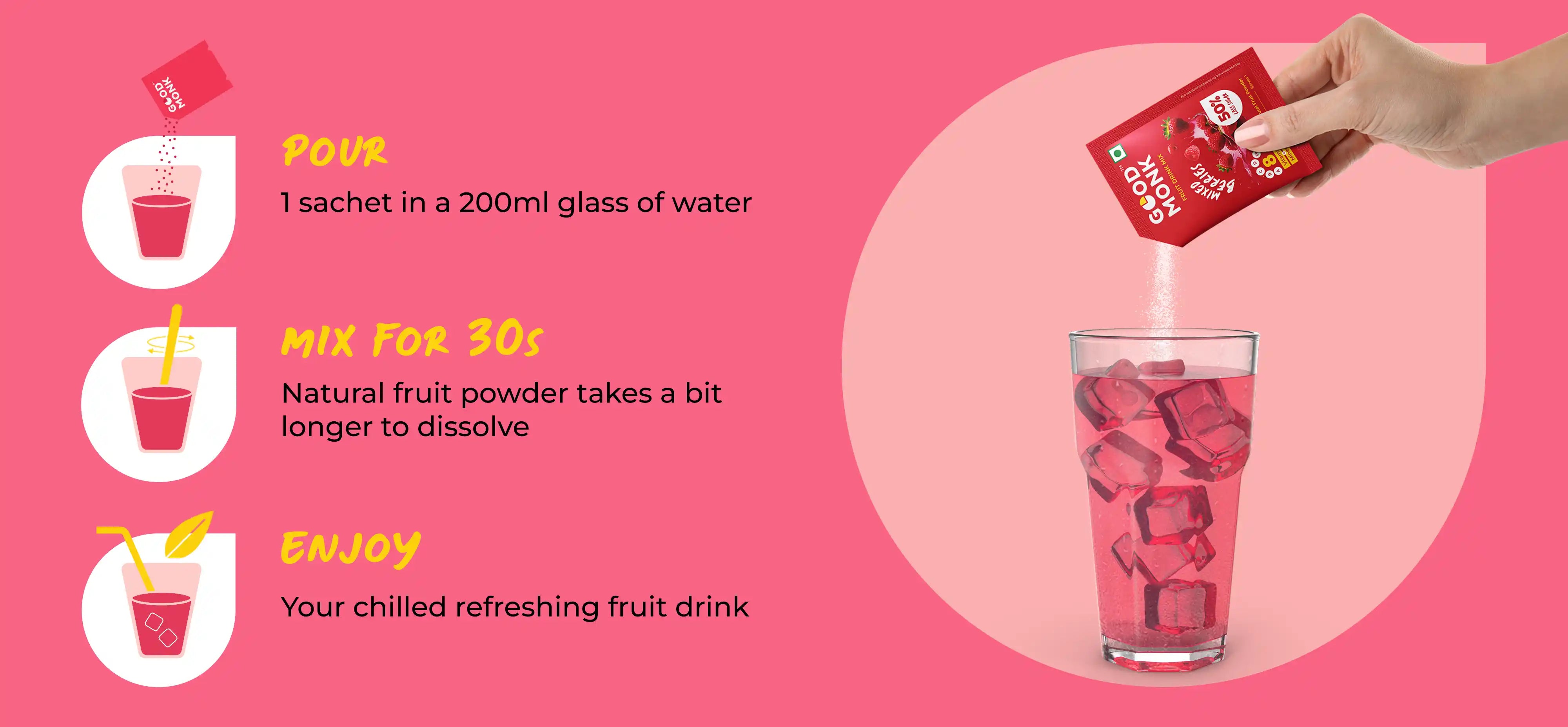 Good Monk’s instant mixed berries health drink is made with real fruit powders. There are no synthetic ingredients or artificial flavours, making this ready-to-mix fruit drink the perfect berry powder drink for health-conscious individuals. It is also a detox fruit drink mix.