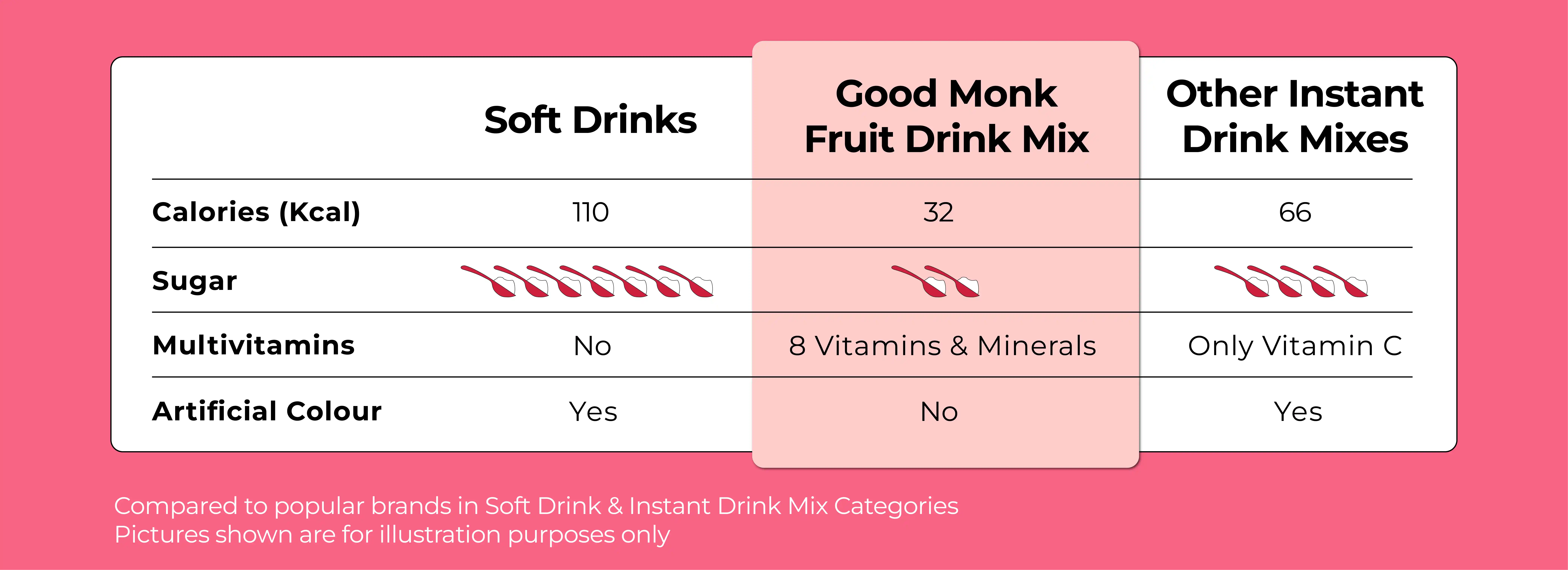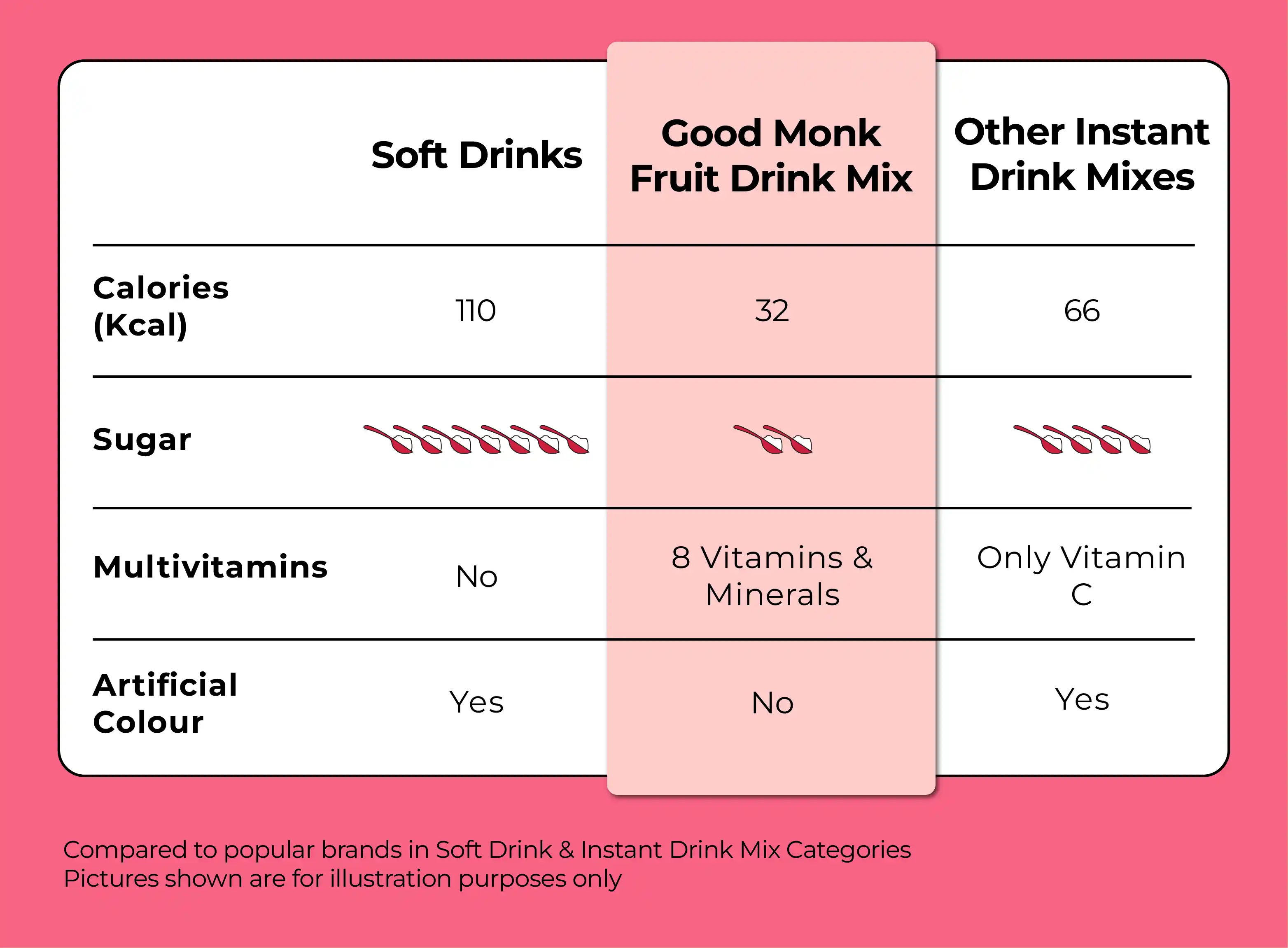 1 sachet of Good Monk’s mixed berry drink mix contains 32 calories, while powdered drink mixes from other brands contain 66 calories in the same amount. The lower calories make this instant mixed berries health drink a daily option.