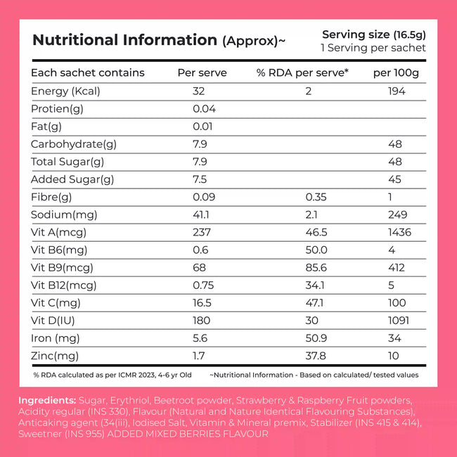 The vibrant blend includes real fruit ingredients like raspberry, strawberry, and beetroot, making it a truly wholesome and fruity refreshment. The result is a sweet and tangy strawberry powder that is not only good for your taste buds but also your body. Moreover, it is completely organic, vegan, free from artificial colours, added flavours, caffeine or fat.